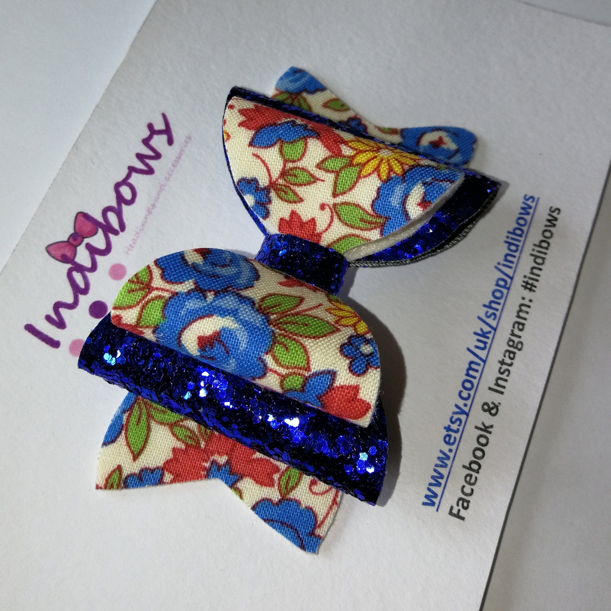 Flower print and blue glitter 4" hair bow. Can be attached to a soft nylon headband or alligator clip.
