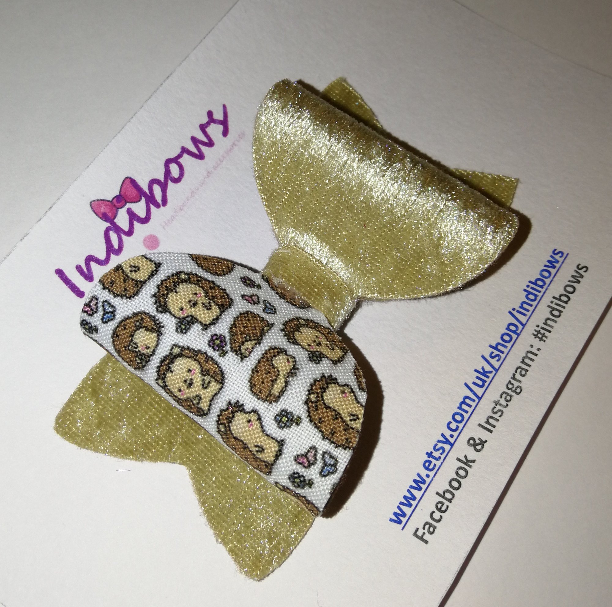 Handmade hair bow with crushed velvet and a hedgehog print.